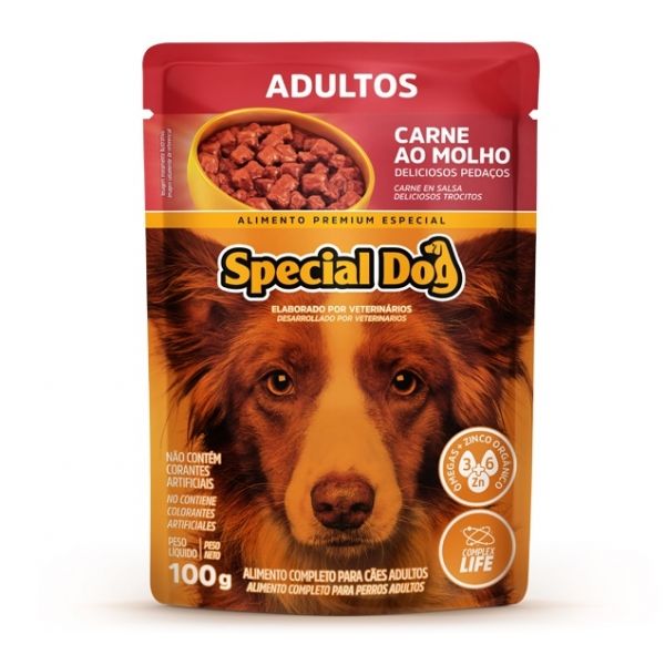 Alimento úmido, completo e balanceado para cães adultos. Special Dog Sachê Adultos Sabor Carne e Sabor Frango são uma excelente combinação de saborosos pedaços macios, cozidos a vapor, com um suculento molho especial. O seu cão vai adorar
