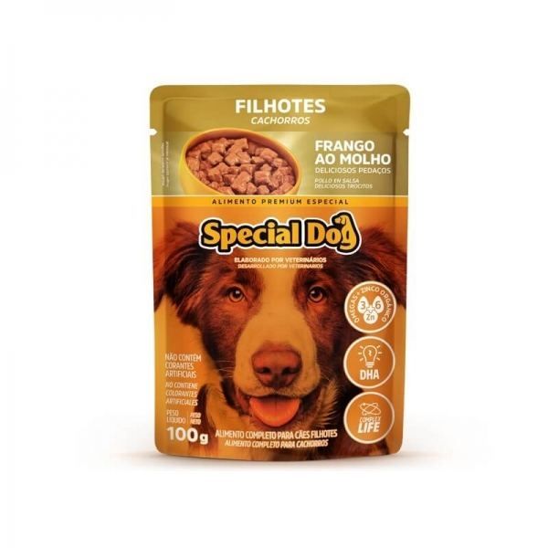 Alimento úmido, completo e balanceado para cães adultos. Special Dog Sachê Adultos Sabor Carne e Sabor Frango são uma excelente combinação de saborosos pedaços macios, cozidos a vapor, com um suculento molho especial. O seu cão vai adorar